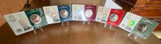 Trittico di monete in argento da 5€ del 2022, dedicato ai Calciatori Panini. - Tre monete da 5 Euro in argento. - Tema: Calciatori Panini. - Anno di emissione: 2022. - Finitura: FdC (Fior di Conio).