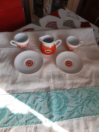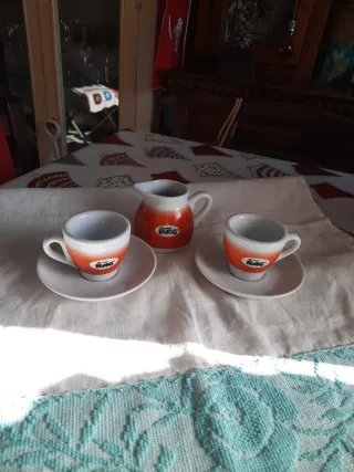 Set da caffè Hag composto da due tazzine con piattini e una lattiera. - Due tazzine con piattini. - Una lattiera. - Design con sfumature arancioni e logo Hag. Da collezione il prezzo è fisso a euro 25