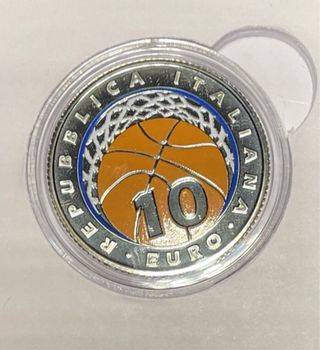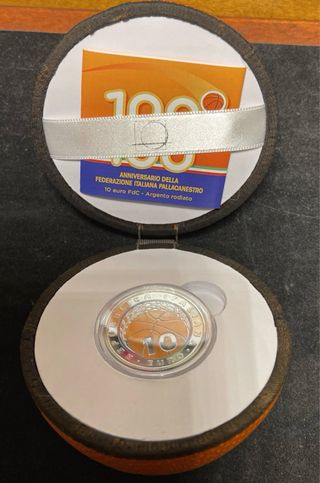 Distribuito dall' Istituto Poligrafico e Zecca dello Stato un nuovo 10 euro colorato in argento rodiato dedicato ai 100 anni della nostra federazione di pallacanestro fornito in una confezione che ricorda un pallone da basket che si apre ed al cui interno e' alloggiata la moneta in capsula. Dritto Veduta dall’alto di un canestro e di un pallone da basket su cui campeggia il numero “10”, indicativo del valore. Nel giro, le scritte “REPUBBLICA ITALIANA” ed “EURO”. Moneta con elementi colorati. Rovescio Al centro, sagome di due giocatori di basket in azione di gioco tra i quali si incastona il numero “100”