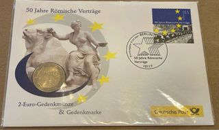 Moneta commemorativa tedesca da 2 Euro del 2007, dedicata al 50° anniversario dei Trattati di Roma. - Anno di emissione: 2007 - Paese: Germania - Valore nominale: 2 Euro - Tema: 50° anniversario dei Trattati di Roma GERMANIA - 2 EURO 2007 TRATTATO DI ROMA - CON ANNULLO FRANCOBOLLO DATA EMISSIONE