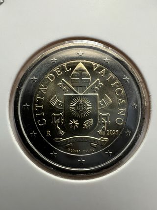 Moneta da 2€ Città del Vaticano coniata nel 2025. - Dritto: Stemma papale con le chiavi di San Pietro e il motto Miserando atque eligendo. - Anno di coniazione: 2025. - Paese: Città del Vaticano.