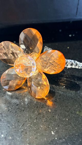 Delizioso fiore decorativo realizzato in vetro sfaccettato. - Petali color arancione e giallo. - Centro trasparente. - Dettagli in vetro trasparente sul gambo.