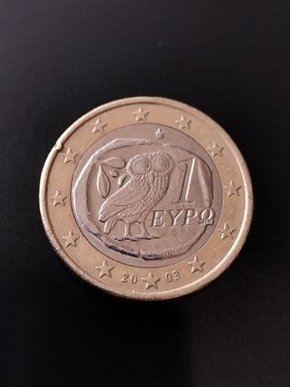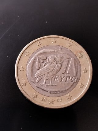 Moneta da 1 Euro della Grecia, coniata nel 2002. Raffigura un gufo, simbolo di saggezza. - Dritto: Gufo con ramo d'ulivo e la scritta 1 EYPΩ. - Rovescio: Mappa dell'Europa con la scritta 2002 e le 12 stelle dell'Unione Europea. - Particolarità: Presenza della lettera S all'interno di una stella sul bordo.
