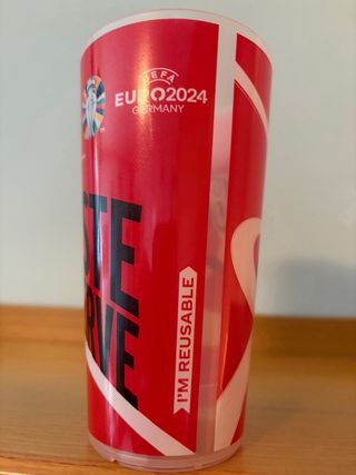 Bicchiere da collezione Coca Cola per Euro 2024. Un pezzo unico per gli appassionati. - Design rosso con logo Coca Cola. - Grafica a tema calcistico. - Hashtag #theritualcup stampato.