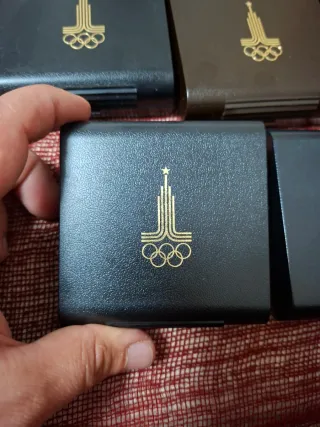 5 euro caduna Scatola per monete d'oro da 100 Rubli, con il simbolo delle Olimpiadi. Scatola Per La Monete D'oro 100 RUBLI OLIMPIADI 1980 MOSCA. UNIONE SOVIETICA diametro 33mm - Colore nero. - Design con logo dorato delle Olimpiadi e stella. - Presenti 3 scatole nere e 1 marrone.