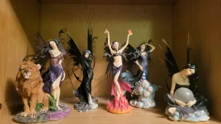 Set di 5 statuette di fate. - Figure dettagliate con ali. - Base decorativa con cristalli. - Diverse pose e abiti.