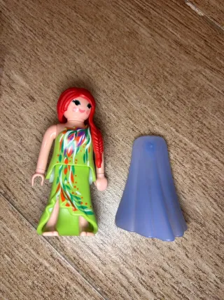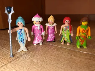 Set di figure Playmobil che include sirene, regine e fate. Senza scatole - Figura di sirena con tridente. - Figura di regina con mantello rosa. - Figura di regina con abito rosa e collana. - Figura di fata con abito verde. - Figura di fata con abito arancione.