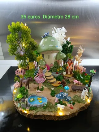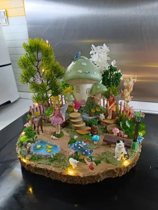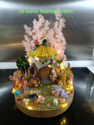 Incantevole centrotavola a tema fate con una casetta dei funghi verde. Include figure di fate, animali e una casetta dei funghi, lampione, panchina, stagno e molti dettagli. Base decorata con elementi naturali e luci LED. Ideale per creare un ambiente magico. Base in legno rustico di 28 cm di diametro. Ho un altro modello simile più piccolo.