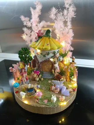 Splendido centrotavola decorativo a tema fate con una casetta gialla. Design dettagliato con figure di fate, animali e fiori. Casetta con tetto giallo e dettagli luminosi. Base rotonda in legno con diametro di 20 cm. Include luci LED calde per un ambiente magico. Ho un altro modello simile più grande.