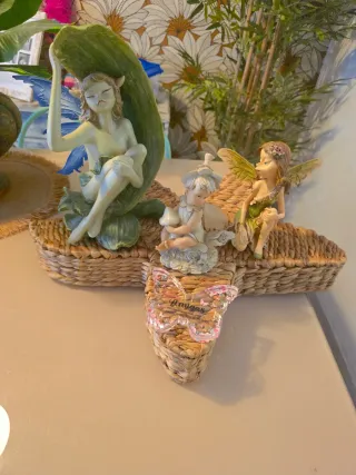 Set di tre figure decorative di fate. - Fata seduta su una foglia. Guarda la foto, una parte della foglia è stata incollata, mi è costato 49€. - Fata con cappello e fungo. Perfetto stato, mi è costato 39€. - Fata con corona di fiori. È fantastica, ma il piede si è staccato da solo, incollarla mi è costato 49€.