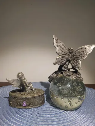 Set decorativo di scatola e sfera con figure di mini fate di provenienza ARTIGIANALE IRELANDESE. - Entrambe le figure presentano incastonature di pietre e brillanti, con molti dettagli disegnati sul metallo (tipo fiori). - La sfera di cristallo è piena di bolle che le conferiscono un aspetto più magico. - Ideale per collezionisti o per gli amanti della magia. - Le dimensioni sono piccole, tra 6 e 10 cm di altezza. TROVERAI ALTRE OPPORTUNITÀ VISITANDO IL MIO PROFILO 😉