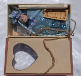 Bambola decorativa in stile fatina, con abito azzurro e dettagli floreali. - Vestito azzurro scintillante. - Fiori viola sui capelli e sull'abito. - Dettagli a forma di stella blu. - Scatola regalo con cuore traforato. Fate realizzate a mano con certificazione in un piccolo paese della Lucchesia. oggetto da collezione