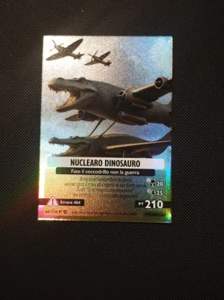 Carta Nuclearo Dinosauro della serie Skifidol. - Illustrazione di un dinosauro bombardiere nucleare con aerei. - Testo: Fate il coccodrillo non la guerra. - Punti PT: 210. - Tipo: Personaggio. - Codice: 66/150 P. - Avviso: Errore 404.