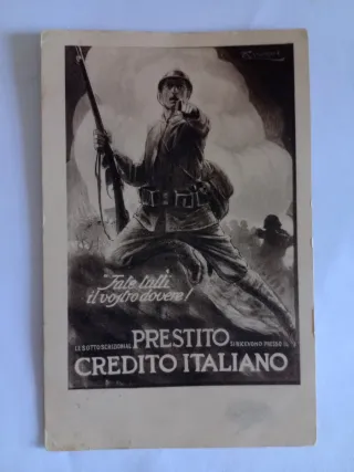 Cartolina postale d'epoca con un'illustrazione di un soldato italiano che punta il dito. - Raffigura un soldato con fucile e uniforme. - Presenta la scritta Fate tutti il vostro dovere! - Promuove il PRESTITO SI RICEVONO PRESSO IL CREDITO ITALIANO.