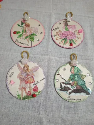 Delizioso set di 4 decorazioni circolari a tema stagioni, ognuna con una fata realizzata a mano. - Decorazioni Primavera, Estate, Autunno, Inverno. - Dettagli realizzate con tecnica di decoupage con elementi naturali e insetti. - Ogni decorazione è dotata di un nastrino dorato e un fiorellino per appenderla.