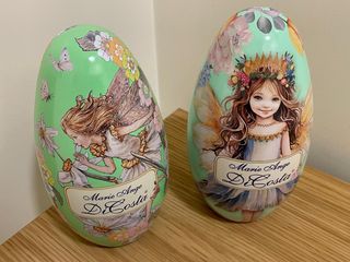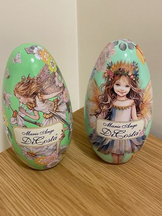Due scatole a forma di uovo, decorate con illustrazioni di fate e fiori, con meccanismo musicale. - Design: Fate e fiori - Marca: Marie Ange Di Costa - Quantità: 2 scatole La chiave del carillon è leggermente storta, ma era cosi quando l’ho acquistato
