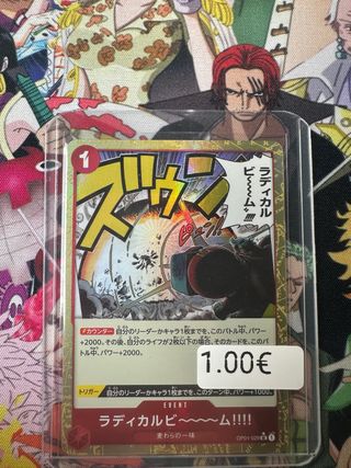 Carta Radical Beam!!!! dall'evento Mugiwara no Ichimi per il gioco di carte collezionabili One Piece. - Codice carta: OP01-029 - Tipo: Evento - Effetto contatore: +2000 Power - Effetto trigger: +1000 Power condizioni in near mint piu acquisti fate piu scende il prezzo! per qualsiasi info chiedete in privato a vostra disposizione!