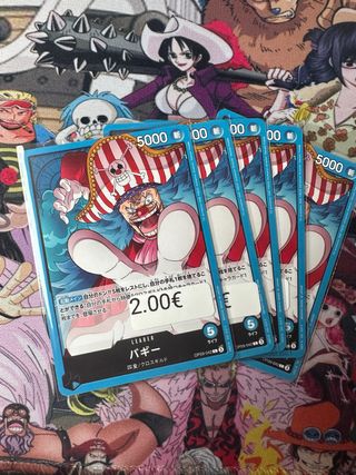 Carte Buggy Leader del gioco di carte collezionabili One Piece TCG. - Set di 4 carte. - Numero carta: OP09-042. - Valore: 5000. - Costo: 2.00€. condizioni in near mint piu acquisti fate piu scende il prezzo! per qualsiasi info chiedete in privato a vostra disposizione!