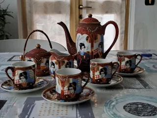 Elegante servizio da caffè in stile giapponese, ideale per aggiungere un tocco di raffinatezza alla tua tavola. - Decorazioni con figure femminili in policromia e oro composto da quattro tazze con piattino. - Include teiera, zuccheriera, lattiera e caratterizzato da volto di geisha visibile in controluce sul fondo delle tazzine - Finiture in oro.
