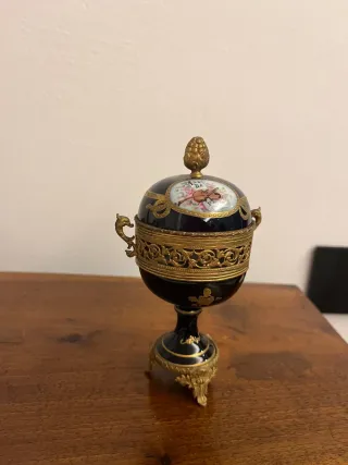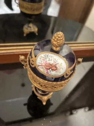 Elegante uovo decorativo in porcellana smaltata blu cobalto con dettagli in bronzo dorato. Realizzato con grande cura artigianale, presenta un raffinato motivo floreale dipinto a mano sia all'interno che sulla sommità, con un delicato decoro musicale (violino e spartito) sul coperchio. La base è finemente lavorata in stile rococò con piedini in metallo dorato. Sotto la base è riportata la scritta "décor main" che conferma la decorazione a mano. ottime condizioni generali. Altezza: circa 10 cm