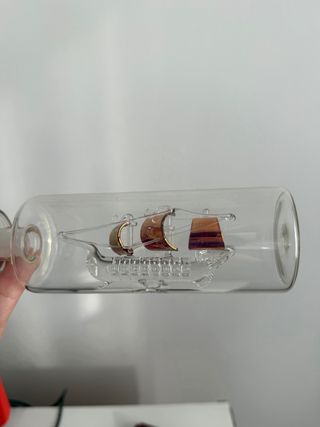 Modellino della nave Bounty all'interno di una bottiglia di vetro. - Dettagli in cristallo. - Base in legno scuro. - Targhetta Bounty dorata.