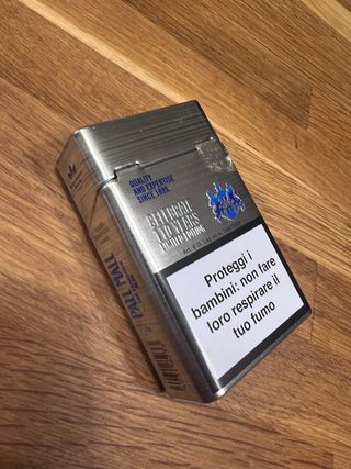 Elegante scatola di latta per pacchetto di sigarette Pall Mall, edizione speciale Celebrate 110 Years. - Design in metallo spazzolato. - Logo Pall Mall in rilievo. - Grafica celebrativa con stemma blu e San Francisco. - Messaggio di avvertimento sanitario stampato. Misura cm 10x6x3