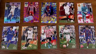 Lottto vario di figurine di calcio delle collezioni 2025/26. Include figurine di giocatori come Mbappé, Iñigo Martínez, Nico Williams e Budimir. Contiene figurine delle serie Flash Back e Master Rookie. Alcuni sono della serie Nuevo Fichaje e Anthology. Vari giocatori di squadre come Real Madrid e Barcelona.
