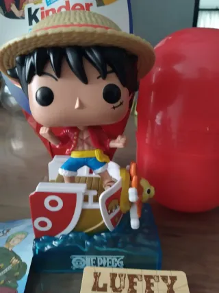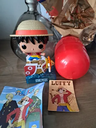 Conjunto di figurine della serie One Piece, include un Funko Pop di Monkey D. Luffy e figurine Kinder Sorpresa. - Figurina Funko Pop di Monkey D. Luffy. - Figurine dei personaggi di One Piece. - Include carta di Luffy.