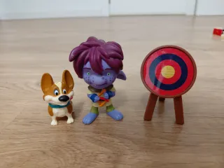 Confezione di figurine dei personaggi di Mike il Cavaliere. Include vari personaggi e accessori. Altezza circa 7 cm. - Figura di Mike con armatura blu. - Figura di Evie con cappello rosso. - Figura di Trollee viola. - Figura di un cane bianco e nero. - Figura di un cane marrone. - Un bersaglio. - Un calderone rosso con monete. - Una rana verde. - Un supporto per appendere.