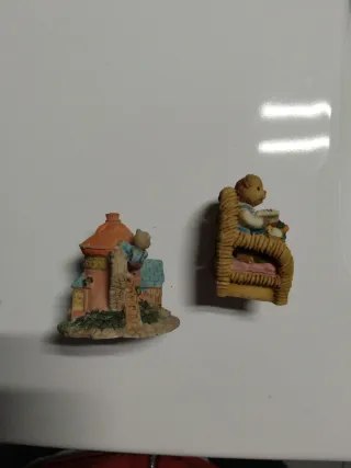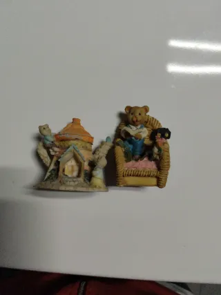 Set di due figurine decorative. Una rappresenta una casetta con un orsetto. L'altra mostra un orso seduto su una sedia a leggere un libro, accompagnato da un altro personaggio. Dettagliate e colorate.