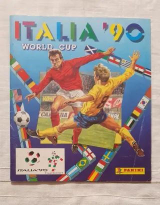 Album Panini dei Mondiali di calcio Italia '90. Mancano 6 figurine - Copertina con i giocatori in azione. - Logo Panini sul retro.