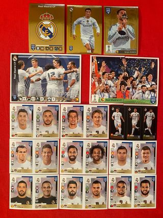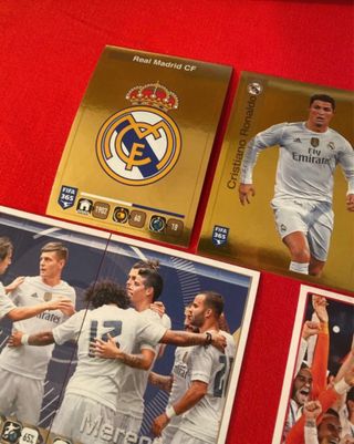 Lotto di 16 figurine tutte diverse dei calciatori Panini del Real Madrid Club de Fútbol nella stagione 2015 2016 nella collezione FIFA 365, in quest'annata il Madrid ha vinto la UEFA Champions League in finale contro l'Atletico ai calci di rigore. Il lotto include tra le altre stickers due figurine di Cristiano Ronaldo (la base e figurina spaleciale dorata golden), un elegante scudetto, la doppia figurina celebrativa Real Madrid Winners, le due figurine che compongono la squadra “Merengues”, la figurina dorata Sergio Ramos adidas Golden Ball, la figurina nera con Gareth Bale, James Rodríguez, Karim Benzema in movimento, ecc
