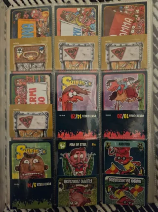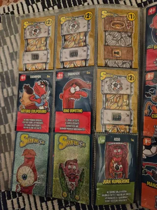 Collezione di carte Skifigol. figurine collezionabili della serie Skifidol. Si tratta di carte raffiguranti personaggi bizzarri e irriverenti. La collezione include diversi personaggi con vari livelli di rarità. Molte delle figurine presentano un punteggio "Punti Forza" indicato sulla carta. - Carte Punti Forza con valori 5/14, 10/20, 14/20. - Personaggi inclusi: Man of Steel, Arbitro, Filippo Zigozaghi, Nardo Bellosguardo. - Carte con disegni a tema calcistico e personaggi stilizzati. Sono 19 pezzi, in ottime condizioni Le foto sono parte integrante della descrizione. Vendo tutto in blocco a un ottimo prezzo.