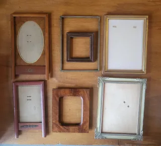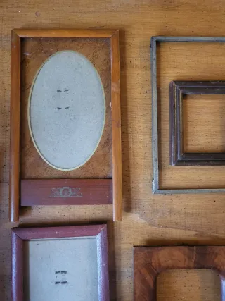 Set di sei cornici portafoto in stili diversi, perfette per dare un tocco vintage alla tua casa. - Cornice ovale in legno con base. - Cornice quadrata in metallo. - Cornice rettangolare in metallo dorato. - Cornice rettangolare in legno scuro con base. - Cornice quadrata in legno. - Cornice rettangolare decorata con angoli in metallo.