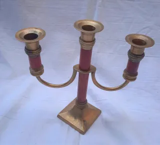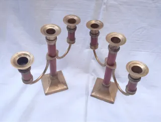 Coppia Candelieri in legno di mogano e ottone anni 50, modello a 3 bracci orizzontali, tubolari in legno di mogano accessori in ottone pieno. Ottime condizioni generali misura altezza cm 23, larghezza cm 22,5, diametro bocciolo 5, base 7,5 x 7,5, circonferenza tubolare 8, peso grammi 871, cadauno.