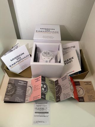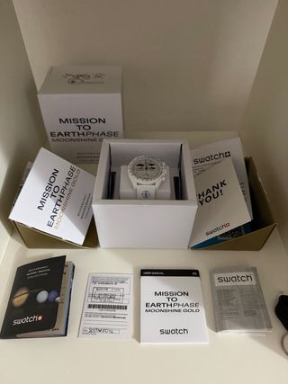 Reloj Swatch Mission to Earthphase Moonshine Gold de la colección Bioceramic. - Modelo: Mission to Earthphase Moonshine Gold. - Colección: Bioceramic MoonSwatch. - Incluye caja original, manual de usuario y tarjeta de garantía.