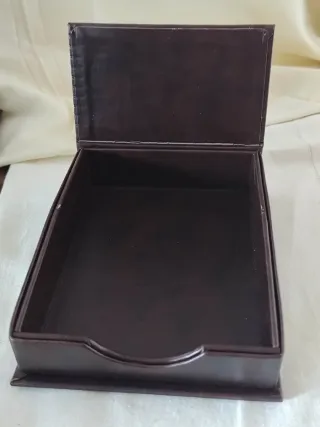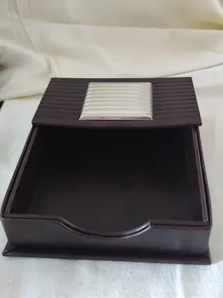 Elegante svuotatasche e porta posta, perfetto per organizzare piccoli oggetti sulla scrivania o all'ingresso. Realizzato in pelle marrone scuro con un inserto decorativo in argento rigato. - Materiale: pelle. - Colore: marrone scuro. - Dettaglio: inserto in argento rigato. Misure svuota tasche 24per11cm Porta posta 13per18cm