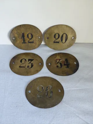 5 antiche targhe numerate in ottone