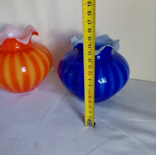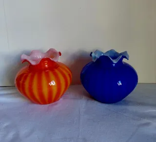Bellissima coppia di vasi in vetro, ispirati ai design degli anni '60 per qualsiasi dubbio chiedere info grazie - Vaso arancione con striature gialle e bordo rosa. - Vaso blu con bordo azzurro. - Design a forma di zucca con bordo ondulato.