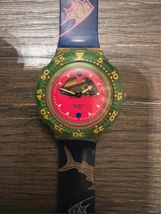 Orologio Swatch Scuba Happy Fish anni 90’ FUNZIONANTE - Cinturino blu con pesci colorati e pinne. - Ghiera verde. - Impermeabile fino a 200m / 656 ft. Solo il passante risulta da sostituire per deterioramento temporale Completo di custodia e certificato di garanzia dell epoca Cone da foto
