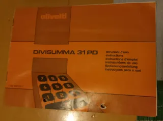 Manuale di istruzioni per la calcolatrice Olivetti DIVISUMMA 31 PD. - Copertina arancione con logo Olivetti. - Titolo DIVISUMMA 31 PD in evidenza. - Testo multilingue: istruzioni d'uso, instructions, instructions d'emploi, instrucciónes de uso, Bedienungsanleitung, instrucçoes para o uso. - Illustrazione della tastiera della calcolatrice.