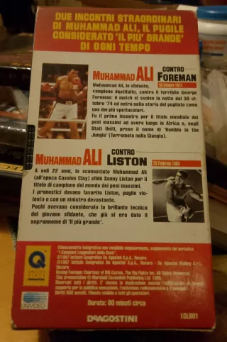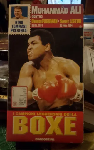 VHS del leggendario pugile Muhammad Ali. - Muhammad Ali contro George Foreman (30 Ott. 1974). - Muhammad Ali contro Sonny Liston (25 Febb. 1964). - Presentato da Rino Tommasi. - Serie I Campioni Leggendari della Boxe De Agostini.