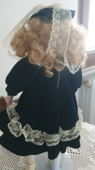 Bambola da collezione in bisquit, abbigliata stile ottocentesco, con dettagli curati. - Capelli biondi e occhi azzurri. - Abito e cappellino in velluto blu e pizzi. - Decorazione sul colletto con perla e dettagli dorati -Mutandoni guarniti in pizzo - calze in pizzo e scarpine in pelle bianca - ha un supporto che la fa stare in piedi