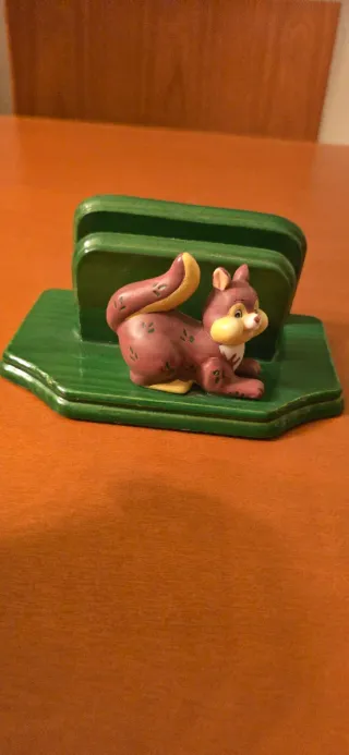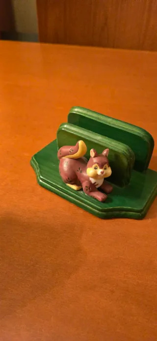 Un simpatico portacarte in legno con una decorazione a forma di scoiattolo. Perfetto per organizzare lettere o appunti. - Base in legno verde. - Decorazione scoiattolo in ceramica colorata. - Dettagli floreali sul corpo dello scoiattolo. Bellissimo portacarte di legno con decoro di scoiattolo. Presso in lire, almeno di 30 anni fa, vintage. Mai usato, 10*15, altezza 7 cm. Box