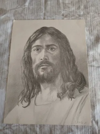Un disegno a matita raffigurante un volto sacro. - Tecnica: matita su carta. - Soggetto: volto con capelli lunghi e barba.