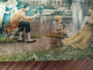 Stampa d'epoca su carta, raffigurante una scena con figure in un giardino. - Stile pittorico classico. - Dettagli curati.