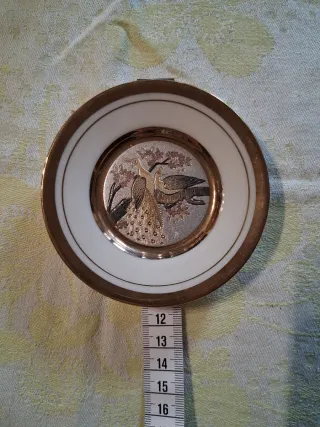 Piatto decorativo in porcellana con decorazione The Art of Chokin. - Raffigurazione di pavoni e fiori di ciliegio. - Bordatura dorata. - Finitura lucida.
