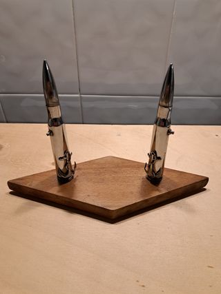 Ha una base in legno e due piccoli pilastri in ferro su cui sono sovrapposte delle ancore.