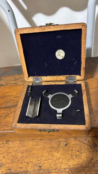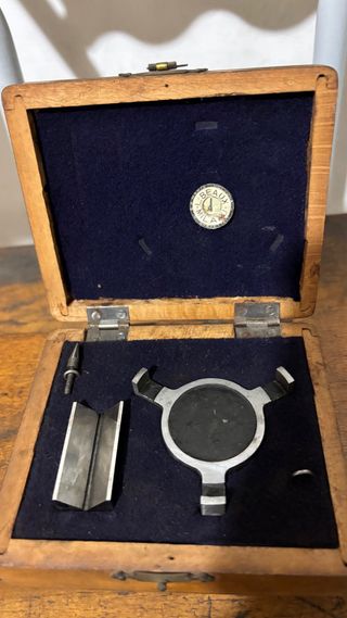 Strumento di precisione d'epoca della storica manifattura Leon Beaux & C. Milano (nota per munizioni e balistica). Custodia originale in legno con velluto blu contenente il corpo principale a tre bracci, barra a V, punte e il marchio "BEAUX MILANO". Un pezzo affascinante e di valore storico per collezionisti. Buone condizioni conservative, segni d'uso. Si segnala la potenziale mancanza di un accessorio (incavo vuoto). PREZZO TRATTABILE.