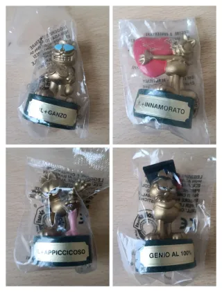 Vendo la collezione completa "I Golden Garfield", uscita nel 2000 all'interno delle merendine della Ferrero. Il lotto è composto da tutti e 10 i personaggi originali (nell'ordine delle foto): Il+Ganzo | Il+Innamorato | Il+Appiccicoso | Genio al 100% | Il+Magico | Il+Schizzato | Il+Vanitoso | Il+Sottosopra | Il+Cattivo | Il+Tenerone I personaggi sono conservati con cura, tutti ancora sigillati tranne "Il+Schizzato". Venduti SOLO in blocco! [Il prezzo è negoziabile! Sono disponibile a offerte ragionevoli!] Per qualsiasi domanda o per altre foto, non esitare a mandarmi un messaggio😊